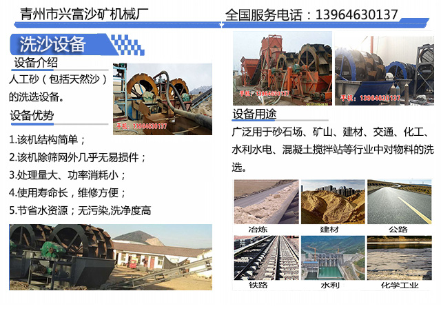 洗沙機是人工砂(包括天然沙)的洗選設備。洗砂機廣泛用于砂石場、礦山、建材、交通、化工、水利水電、混凝土攪拌站等行業中對物料的洗選,它能除去覆蓋 砂石表面的雜質,同時破壞包覆砂粒的水汽層,以利于脫水,起到高效洗砂清洗作用。洗砂機又叫洗石機,主要用于砂類產品的去除雜質(如粉塵)的機器,因較多 使用水洗的方法,故稱為洗砂。其中,因為一般是對機制砂(由石料破碎而成),所以也被稱為洗石機。因其外觀和原理不同,也被稱為螺旋洗砂機,滾筒洗砂機, 水輪洗砂機(又稱輪式洗砂機),震動洗砂機等。