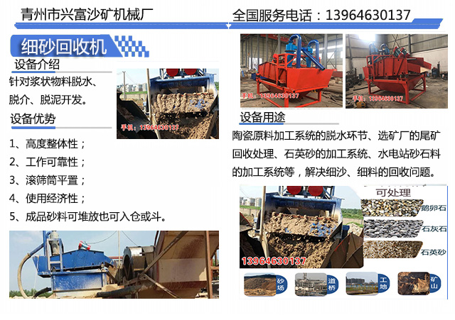 目前現有的人工細沙生產線上,絕大部分采用濕法生產工藝,不論采用何種形式的洗砂機,其最大的缺點就是細沙流失嚴重,嚴重影響沙子的級配,造成級配不合理,細度模數偏粗,大大降低了機制砂的產品質量。過多的細沙排放,還會造成環境污染。未解決上述問題,潛心研發了細沙回收機(細砂回收機),該細沙回收系統吸收國外先進技術,結合本土砂粉實際情況而設計的細砂回收設備。細沙回收機廣泛應用于水電站砂石骨料加工系統、玻璃原材料加工系統、人工制沙生產線、選煤廠粗煤泥的回收以及環保工程(泥漿凈化),可有效解決細沙回收問題。